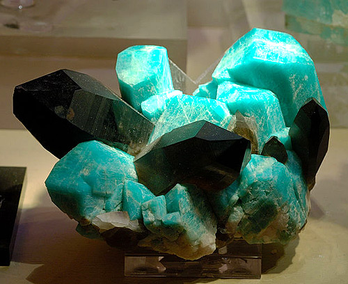 В собраниях Эрмитажа имеются четыре великолепные вазы и ряд других декоративно-художественных предметов из амазонита работы Петергофской гранильной фабрики 80-х гг. XVIII в. В технике «русской мозаики» из подобранных кусочков амазонита изготовляли столешницы для дворцов, а на Всемирной выставке в Париже в 1900 г. была выставлена мозаичная карта Франции работы екатеринбургских мастеров, при создании которой использовали уральский амазонит; позднее она экспонировалось в Лувре и сейчас находится во Франции.