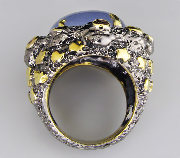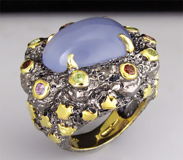Кольцо из черненого стерлингового серебра 925 пробы с халцедоном (кабошон 18×11 мм), перидотами, аметистами, гранатами, голубыми топазами. Общая масса вставок 16,3 карат. Выборочное золочение. Площадка кольца — 28×23 мм, высота — 12 мм. Вес — 19 гр.
