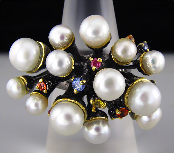 Кольцо из черненого стерлингового серебра 925 пробы с жемчугом (3–5 мм) и разноцветными сапфирами. Выборочное золочение. Площадка кольца — 34×24 мм. Вес — 18,8 гр.
