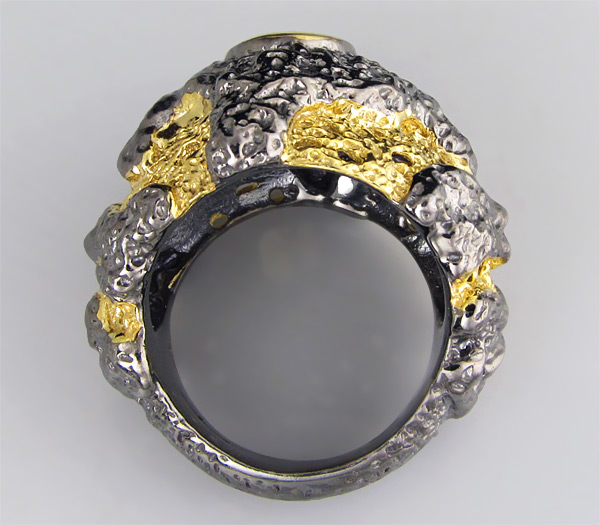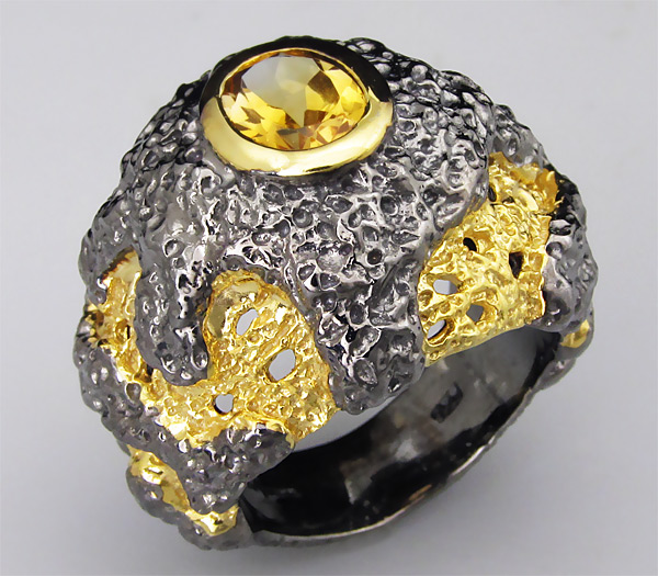 Кольцо из черненого стерлингового серебра 925 пробы с цитрином. Выборочное золочение. Площадка кольца — 27×22 мм. Вес — 16,0 гр.
