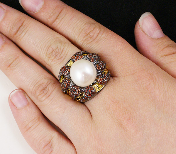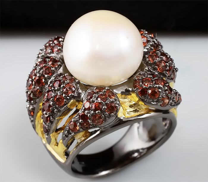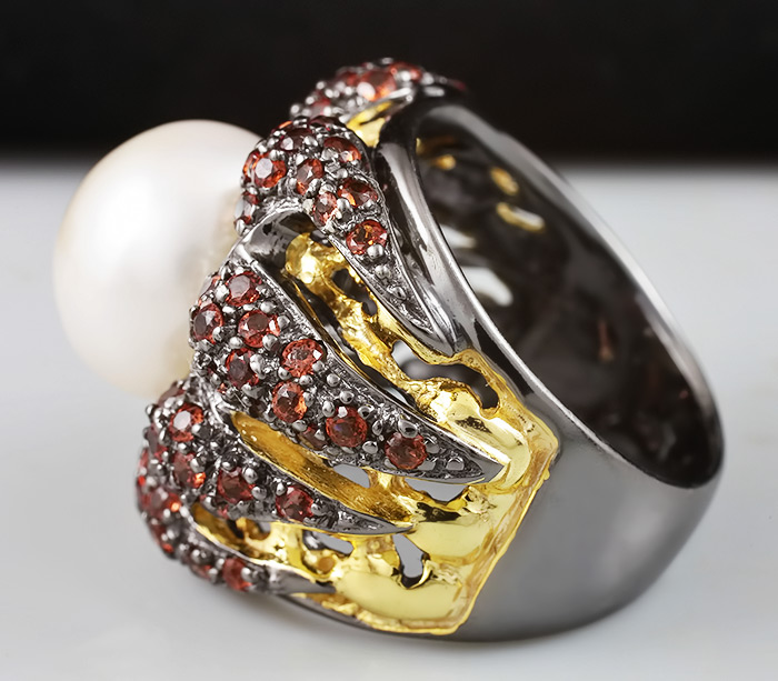 Кольцо из черненого стерлингового серебра 925 пробы с жемчугом и гранатами. Выборочное золочение. Площадка кольца — 24×21 мм. Вес — 18,3 гр.
