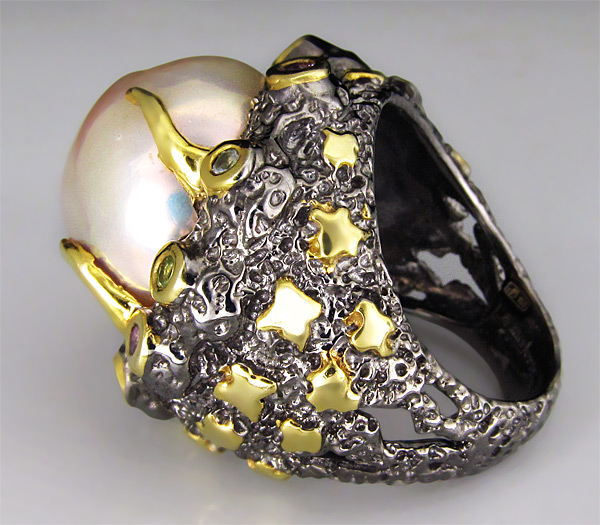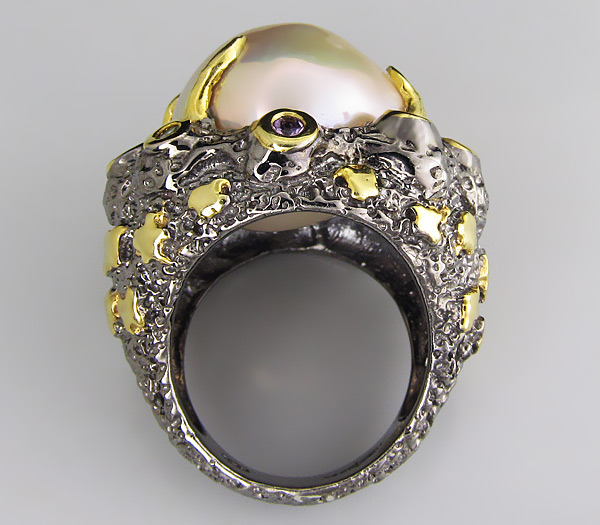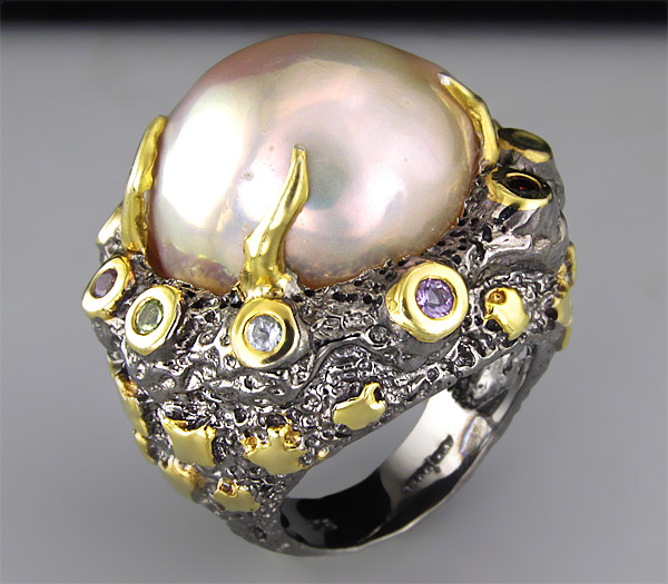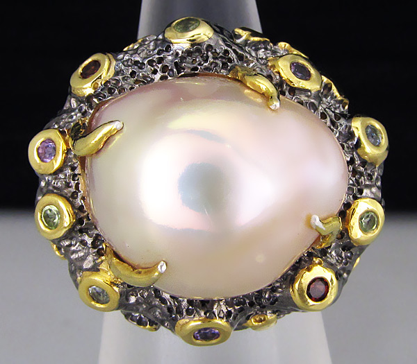 Кольцо из черненого стерлингового серебра 925 пробы с фантазийной жемчужиной (19×16 мм) и самоцветами. Выборочное золочение. Вес — 21,4 гр. Площадка кольца — 28×25 мм.