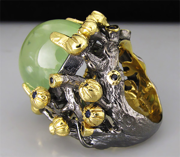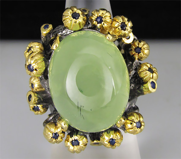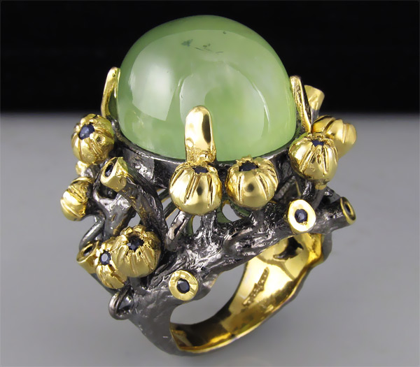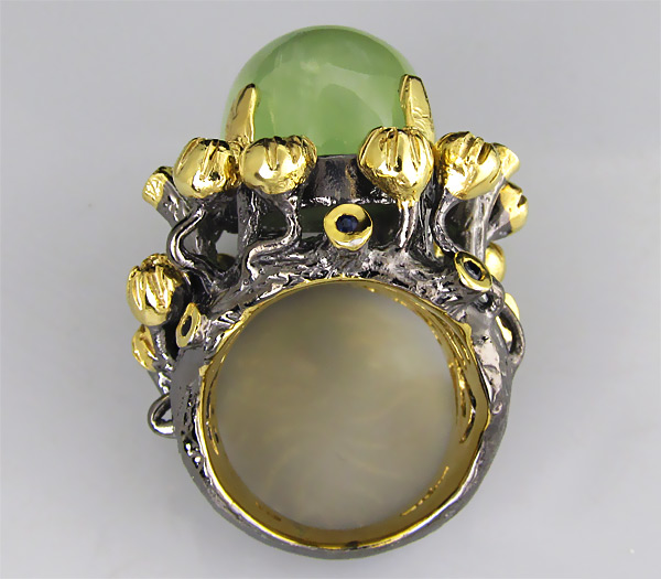 Кольцо из черненого стерлингового серебра 925 пробы с крупным пренитом (кабошон 20×16 мм) и синими сапфирами. Вес — 28,70 гр. Площадка кольца — 31×30 мм. Выборочное золочение.