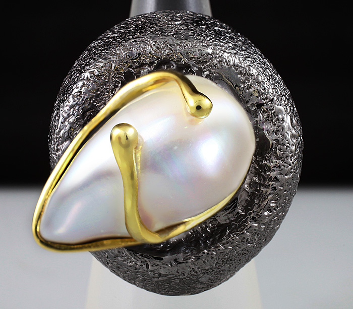 Кольцо из черненого стерлингового серебра 925 пробы с фантазийной жемчужиной. Выборочное золочение. Вес — 33,6 гр. Площадка кольца — 31×29 мм.
