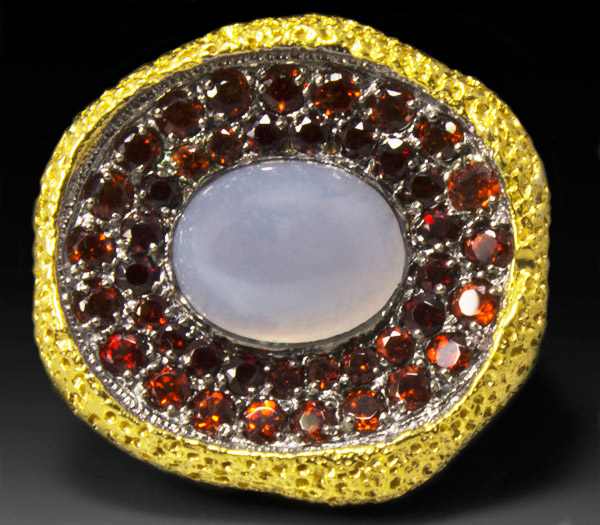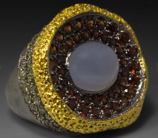 Кольцо из родированного стерлингового серебра 925 пробы с крупным халцедоном, гранатами и перидотами. Выборочное золочение. Вес — 16,0гр. Размер площадки — 28×26 мм.