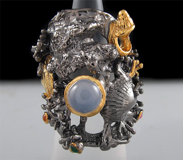 Кольцо из стерлингового черненого серебра 925 пробы с халцедоном (кабошон 8 мм), зеленым агатом и розовым кварцем. Выборочное золочение. Вес — 24,6 гр. Размер площадки — 35×24 мм.