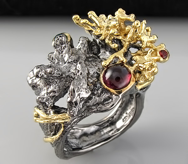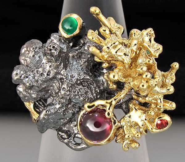 Кольцо из черненого стерлингового серебра 925 пробы с родолитом, цаворитом гранатами и зеленым агатом. Выборочное золочение. Вес — 21,1 гр.