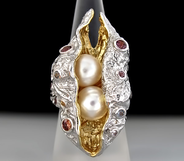 Кольцо из стерлингового родированного серебра 925 пробы с подвижным жемчугом, разноцветными сапфирами и родолитами гранатами. Выборочное золочение. Вес — 22,8 гр. Размер площадки — 40×20 мм.