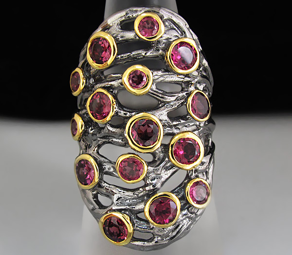 Кольцо из родированного стерлингового серебра 925 пробы с родолитами (3–5 мм). Вес —15,7 гр. Размер площадки — 35×21 мм. Выборочное золочение.