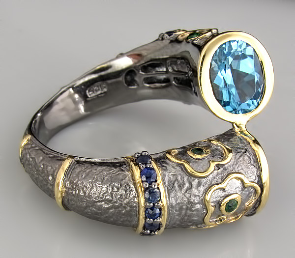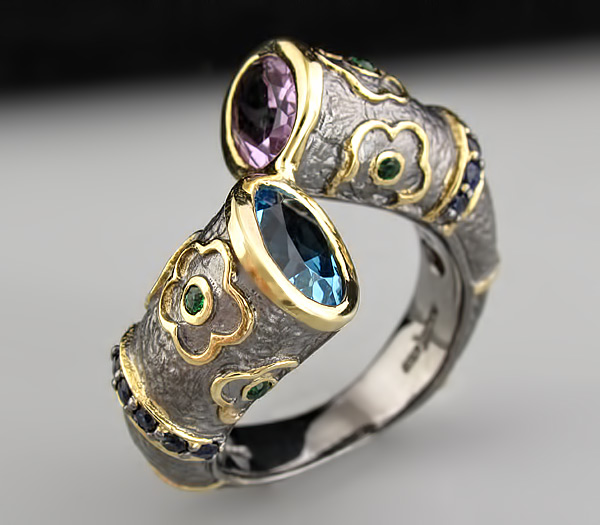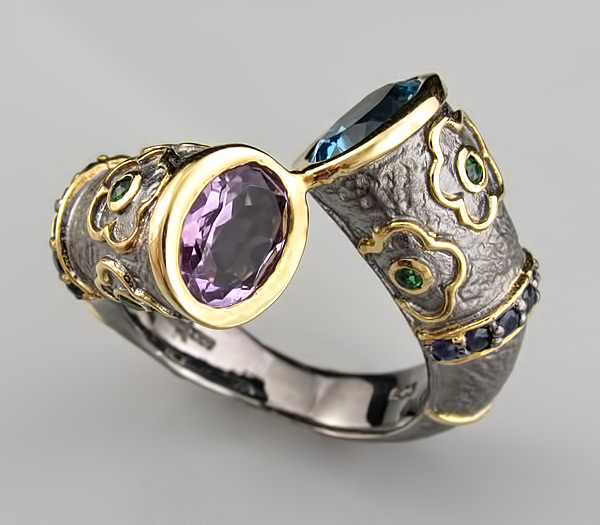 Кольцо из матированного черненого стерлингового серебра 925 пробы с аметистом, топазом, синими сапфирами и цаворитами гранатами. Вес — 11,6 гр. Площадка кольца — 20×28 мм. Выборочное золочение.
