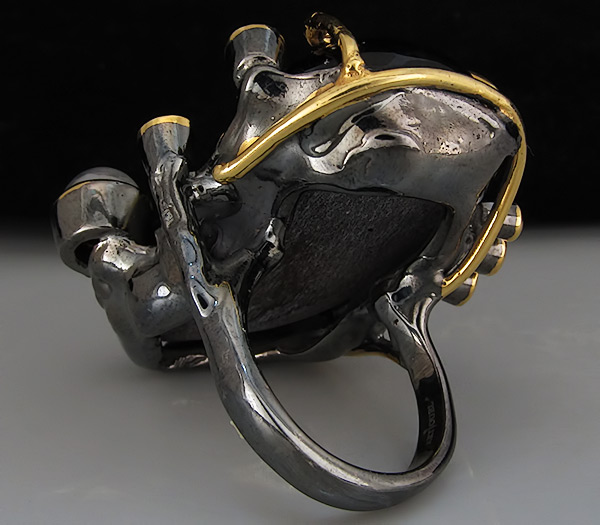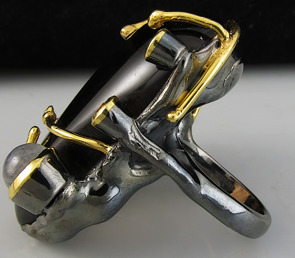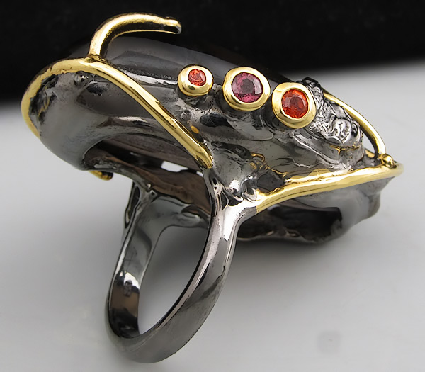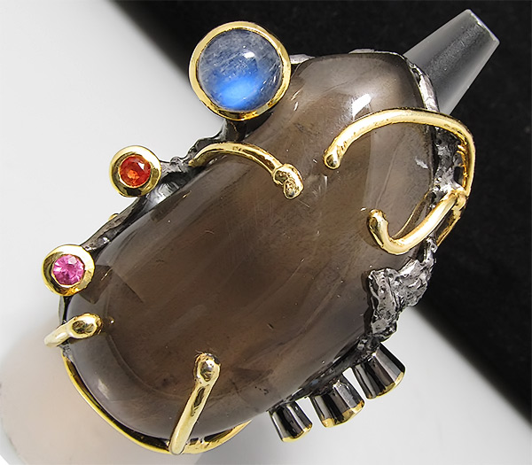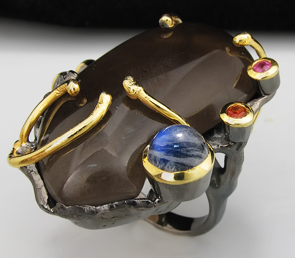 Кольцо из черненого стерлингового серебра 925 пробы с дымчатым топазом кабошоном (42×22 мм), лабрадоритом и 5-тью цветными сапфирами. Вес — 38,7 гр. Площадка кольца — 45×36 мм. Выборочное золочение.