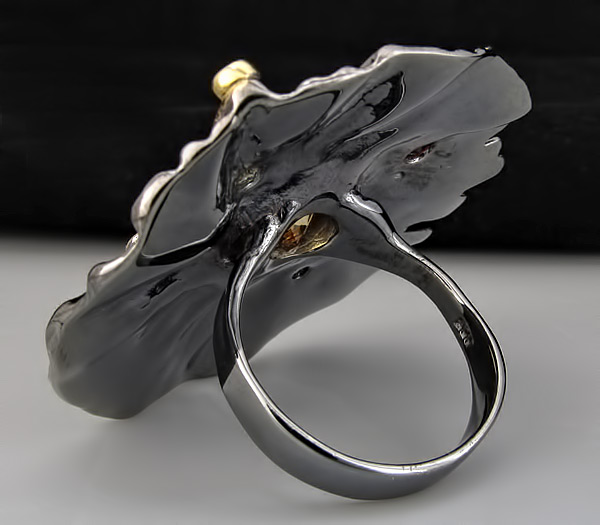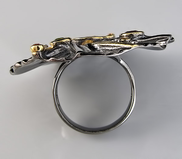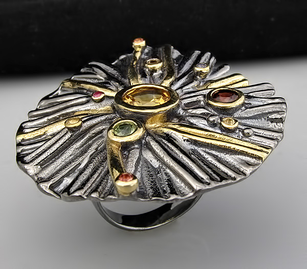 Кольцо из черненого стерлингового серебра 925 пробы с цитринами (от 2 до 7 мм), гранатом, перидотом и разноцветными сапфирами. Вес кольца — 14,9 гр. Площадка кольца — 40×40 мм. Выборочное золочение.