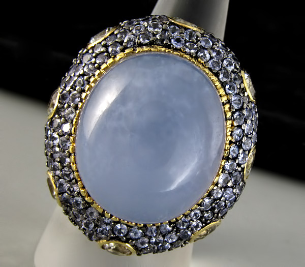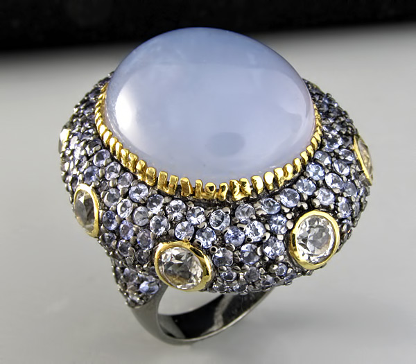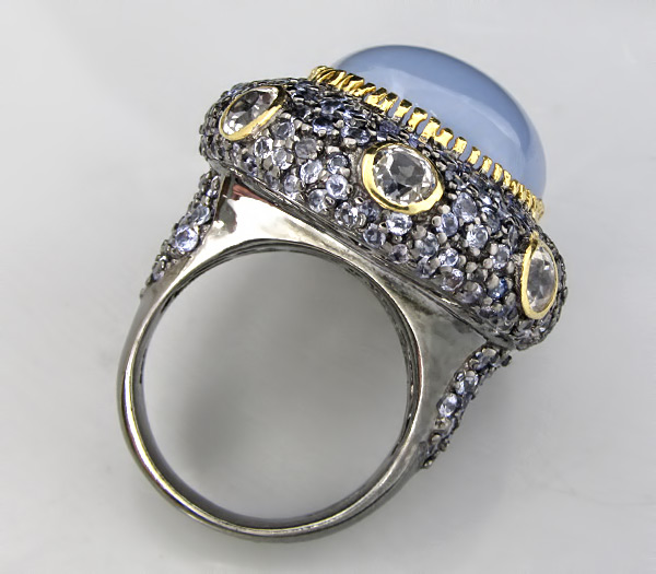Кольцо из черненого стерлингового серебра 925 пробы с халцедоном кабошоном (20×17 мм), бесцветными цирконами и танзанитами. Вес кольца — 18 гр. Площадка кольца — 32×28 мм. Выборочное золочение.