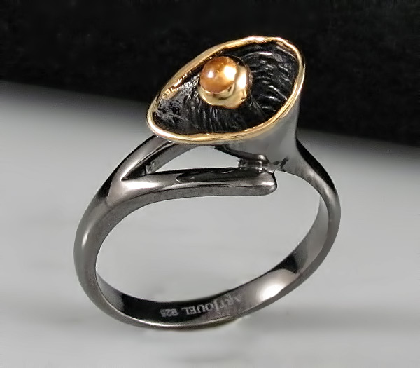 Кольцо из черненого стерлингового серебра 925 пробы с цитрином кабошоном (3 мм). Вес кольца — 3,4 гр. Площадка кольца — 10×8 мм. Выборочное золочение.