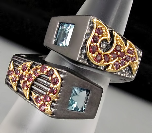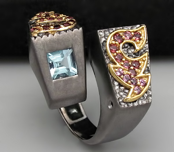 Кольцо из матированного черненого стерлингового серебра 925 пробы с аквамаринами и родолитами гранатами. Вес кольца — 14,2 гр. Площадка кольца — 27×22 мм. Выборочное золочение.