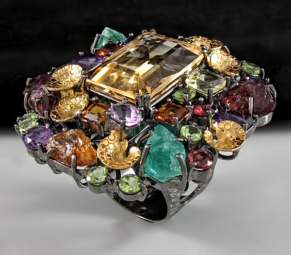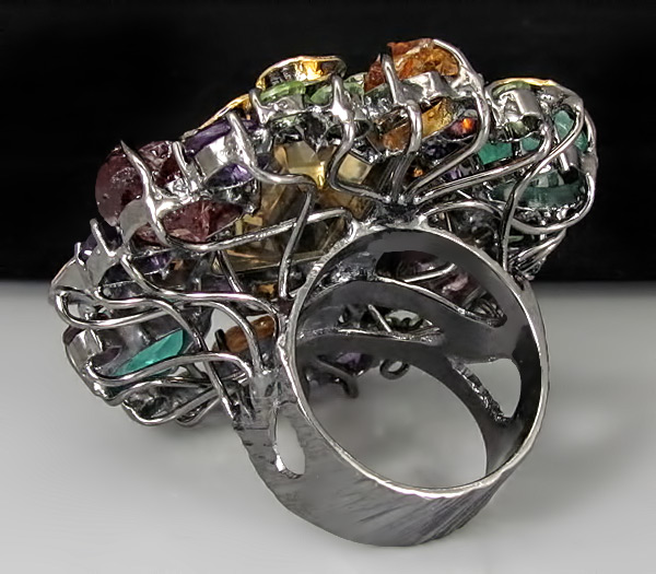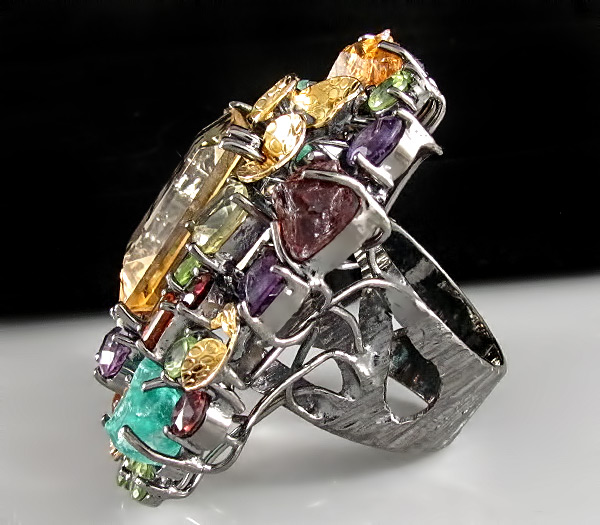 Кольцо из черненого стерлингового серебра 925 пробы с цитринами, аметистами, апатитами, турмалинами, родолитами гранатами и перидотами. Вес кольца — 27,1 гр. Размер центральной вставки (13×18мм). Площадка кольца — 44×42 мм. Выборочное золочение.