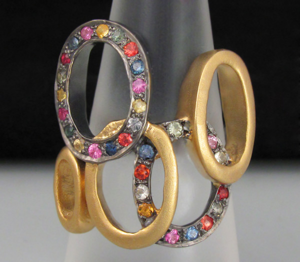Кольцо из матированного черненого стерлингового серебра 925 пробы с разноцветными сапфирами. Вес кольца — 10,9 гр. Площадка кольца — 25×23 мм. Выборочное золочение.