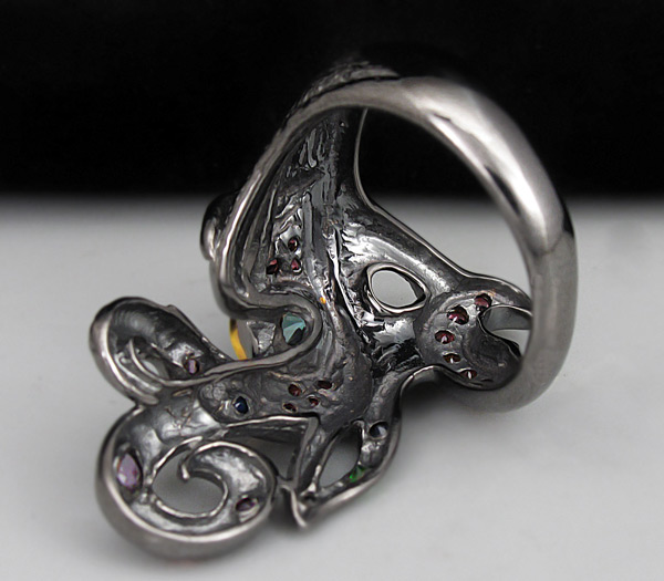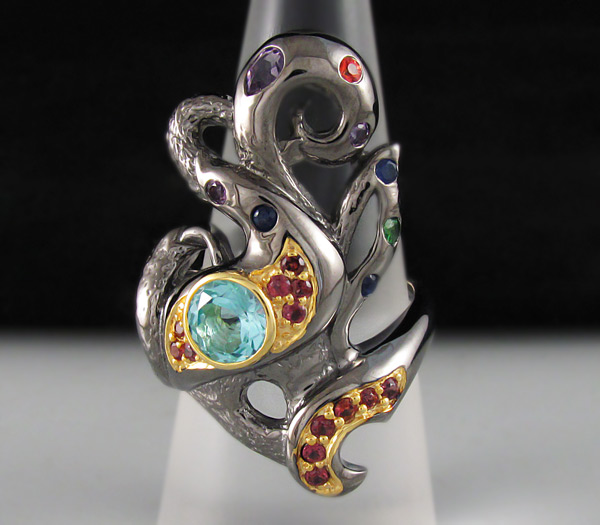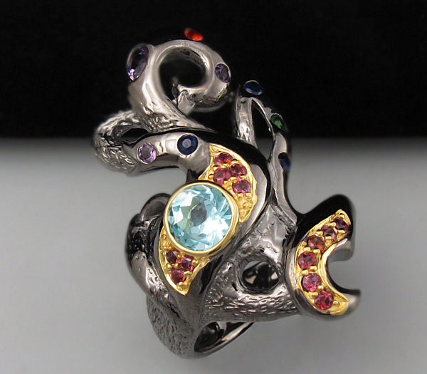 Кольцо из черненого стерлингового серебра 925 пробы с топазом, аметистами, сапфирами, родолитами и цаворитом гранатом. Вес кольца — 8,6 гр. Площадка кольца — 35×21 мм. Выборочное золочение.
