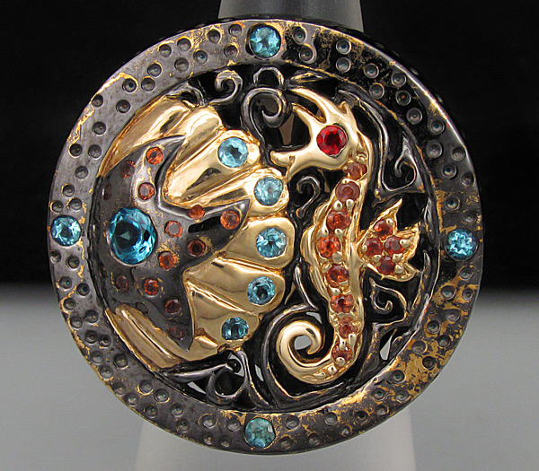 Кольцо из черненого стерлингового серебра 925 пробы с гранатом, топазами и сапфирами. Вес кольца — 21,9 гр. Площадка кольца — 30×29 мм. Выборочное золочение.