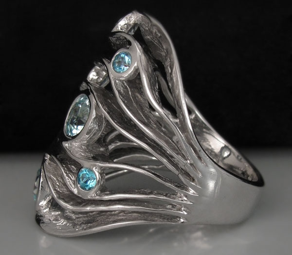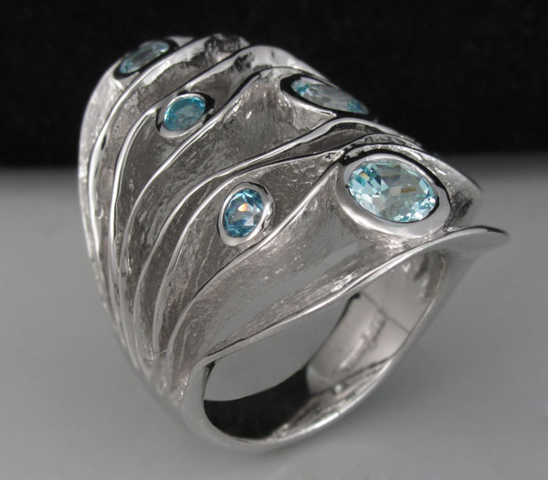 Кольцо из текстурного родированного стерлингового серебра 925 пробы с топазами. Вес кольца — 15,3 гр. Площадка кольца — 29×22 мм.