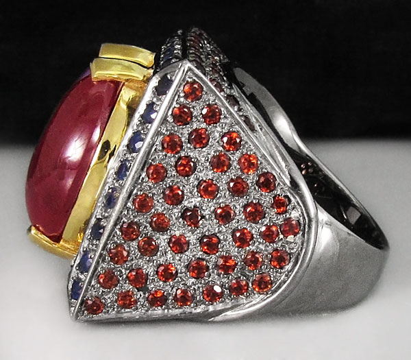 Кольцо из черненого стерлингового серебра 925 пробы с сапфирами, аметистом и гранатами. Размер центральных кабошонов (16×9мм). Вес кольца — 16,8 гр. Площадка кольца — 25×23 мм. Выборочное золочение и матирование.