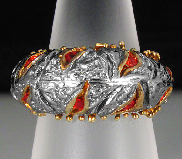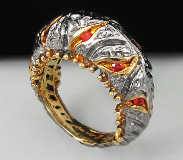 Кольцо из черненого текстурного стерлингового серебра 925 пробы с сапфирами. Вес кольца — 8,4 гр. Площадка кольца — 26×12 мм. Выборочное золочение.В наличии кольцо рахмером 17.75