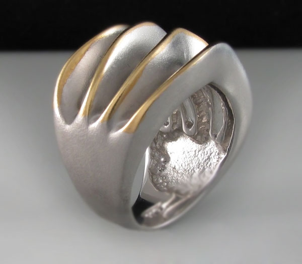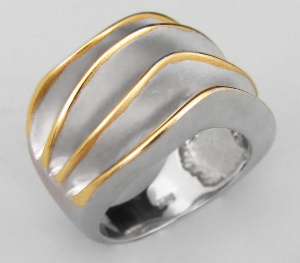 Кольцо из родированного матированного стерлингового серебра 925 пробы. Вес кольца — 13 гр. Площадка кольца — 24×16 мм. Выборочное золочение.