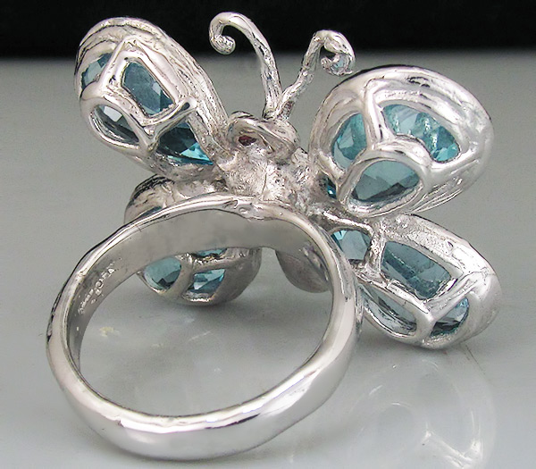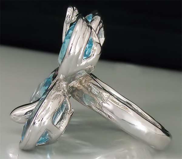 Кольцо из родированного стерлингового серебра 925 пробы с топазами (капля 14×9 мм), аметистом и сапфирами. Вес кольца — 15,6 гр. Площадка кольца — 34×25 мм.