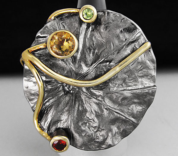 Кольцо из черненого стерлингового серебра 925 пробы с цитрином, гранатом и перидотом. Вес кольца — 27,5 гр. Площадка кольца — 43×41 мм. Выборочное золочение и матирование.