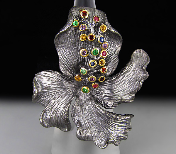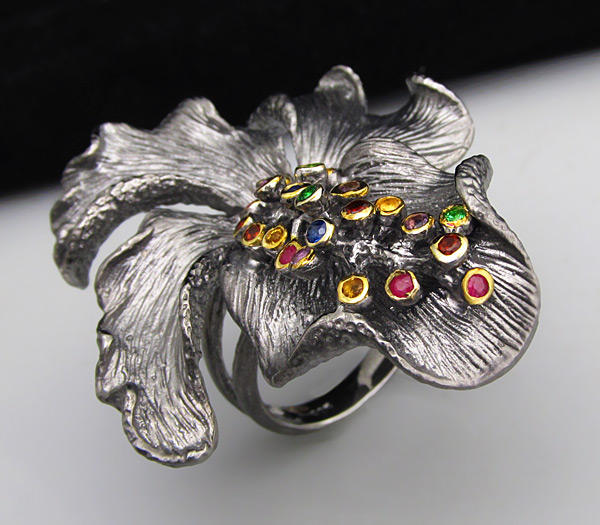 Кольцо из черненого стерлингового серебра 925 пробы с аметистами, цитринами, разноцветными сапфирами, цаворитами и мозамбикскими гранатами. Вес кольца — 17,7 гр. Площадка кольца — 45×37 мм. Выборочное золочение.