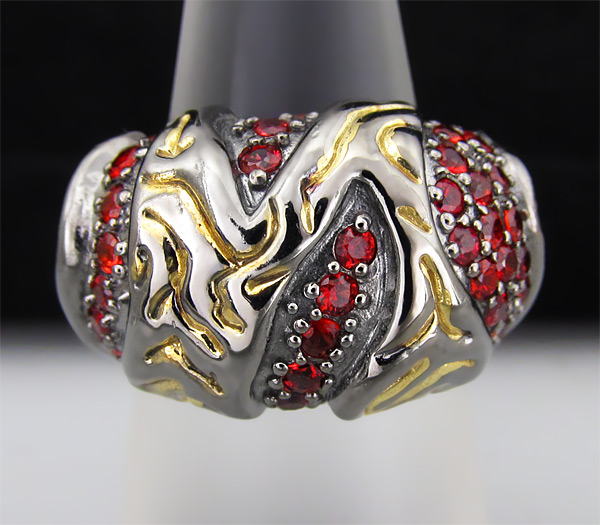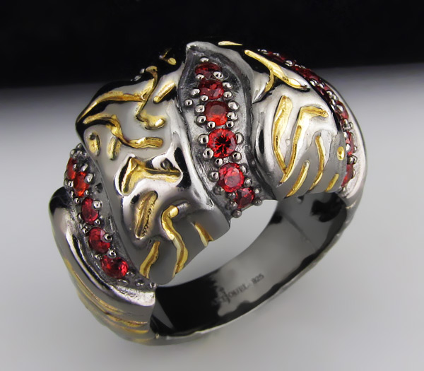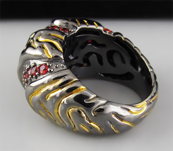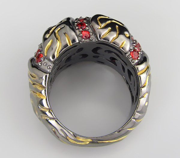 Кольцо из черненого стерлингового серебра 925 пробы с сапфирами. Вес кольца — 15,5 гр. Площадка кольца — 26×16 мм. Выборочное золочение.