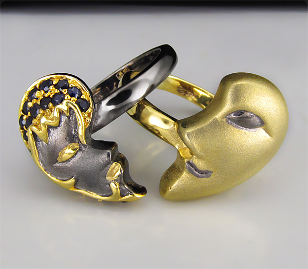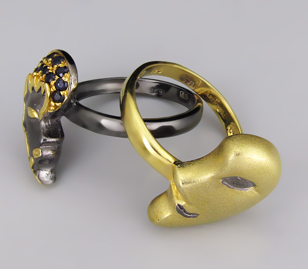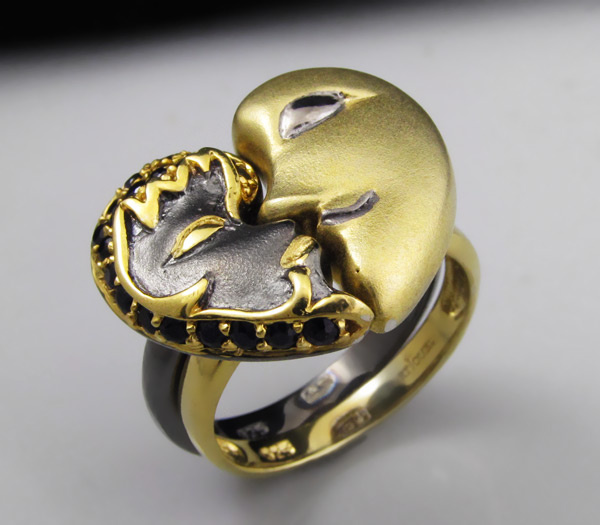 Составное кольцо из черненого стерлингового серебра 925 пробы с черными шпинелями. Вес кольца — 7,1 гр. Площадка кольца — 21×18 мм. Выборочное золочение и матирование.