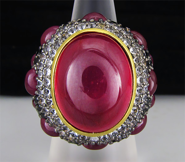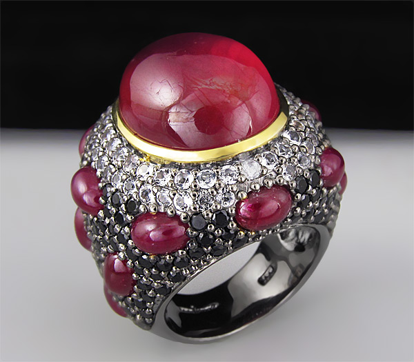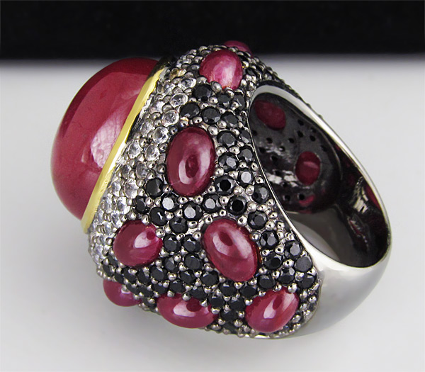 Кольцо из черненого стерлингового серебра 925 пробы с рубинами, топазами, шпинелями и сапфирами. Вес кольца — 25,7 гр. Площадка кольца — 29×29 мм. Выборочное золочение.