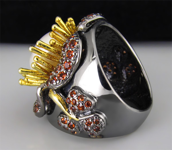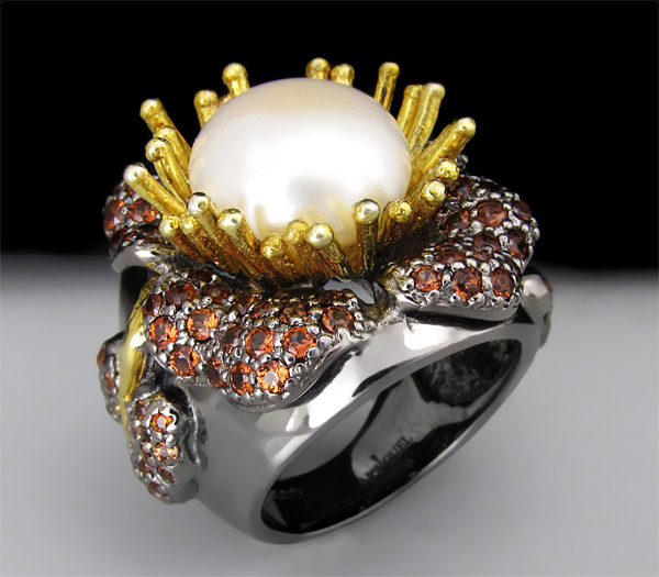 Кольцо из черненого стерлингового серебра 925 пробы с жемчугом и гранатами. Вес кольца — 17,4 гр. Площадка кольца — 27×25 мм. Выборочное золочение.