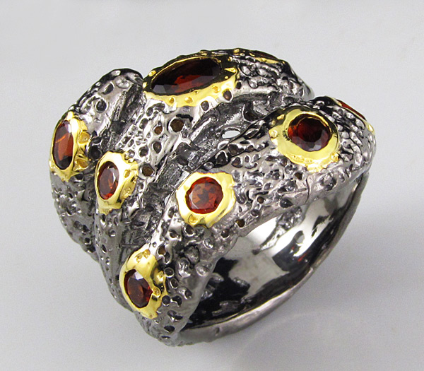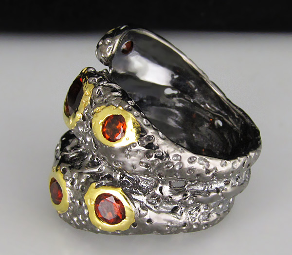Кольцо из черненого стерлингового серебра 925 пробы с гранатами. Вес кольца — 12,4 гр. Площадка кольца — 24×22 мм. Выборочное золочение.