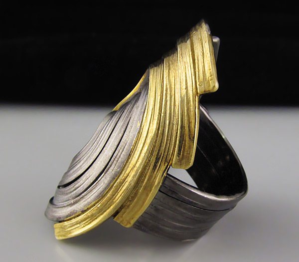 Кольцо из черненого стерлингового серебра 925 пробы. Вес кольца — 17,6 гр. Площадка кольца — 38×23 мм. Выборочное золочение и матирование.