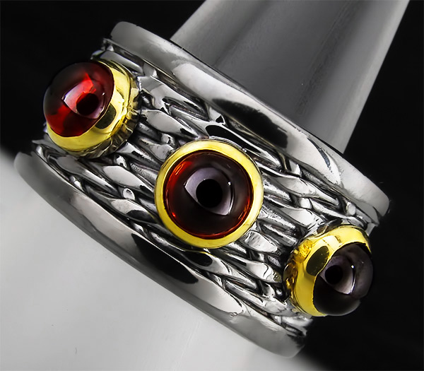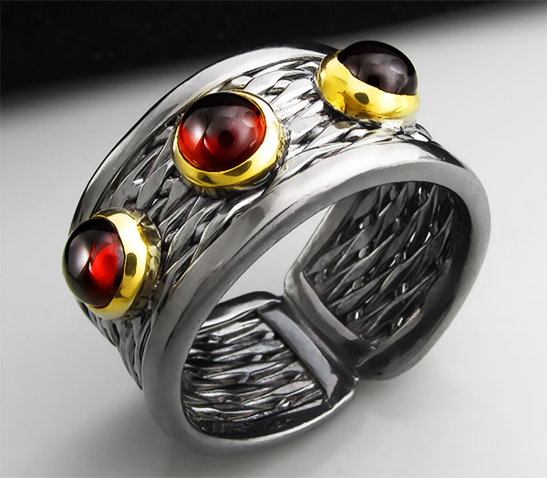 Кольцо из черненого стерлингового серебра 925 пробы с гранатами. Вес кольца — 8,7 гр. Площадка кольца — 22×12 мм. Выборочное золочение.