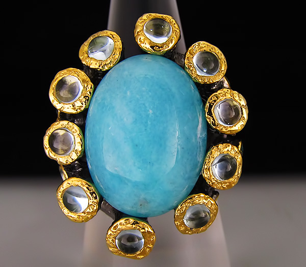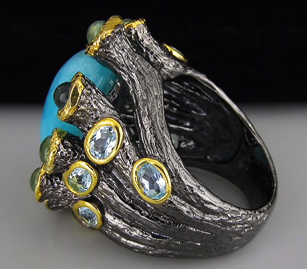 Кольцо из черненого стерлингового серебра 925 пробы с амазонитом и топазами. Вес кольца — 23,8 гр. Площадка кольца — 31×25 мм. Выборочное золочение.