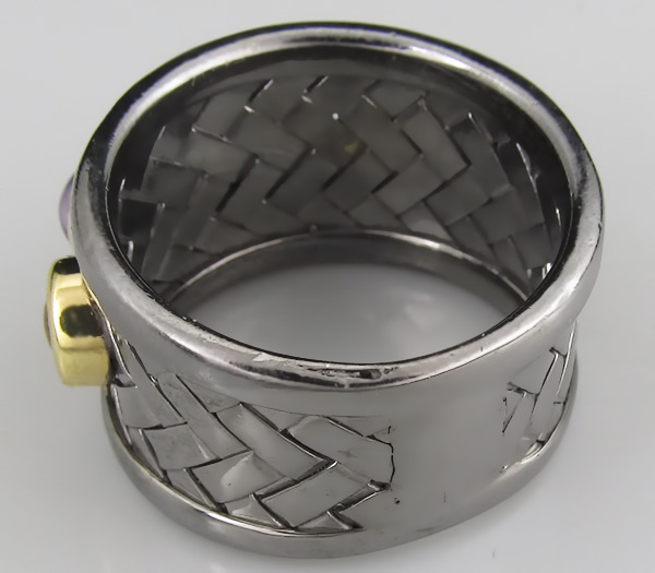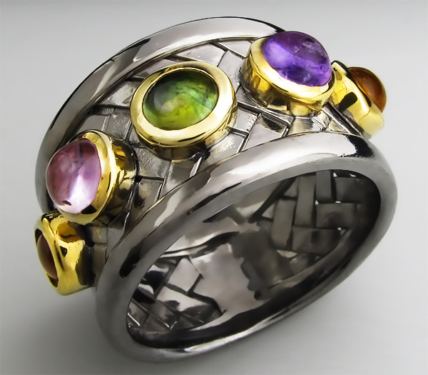 Кольцо из черненого стерлингового серебра 925 пробы с турмалином, аметистами и цитринами. Вес кольца — 8,4 гр. Площадка кольца — 25×14 мм. Выборочное золочение.