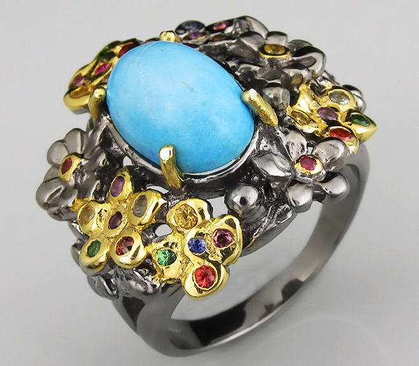 Кольцо из черненого стерлингового серебра 925 пробы с бирюзой, сапфирами, аметистами, цаворитами и родолитами гранатами. Вес кольца — 10,4 гр. Площадка кольца — 23×23 мм. Выборочное золочение.В наличии кольцо размером: 18.5