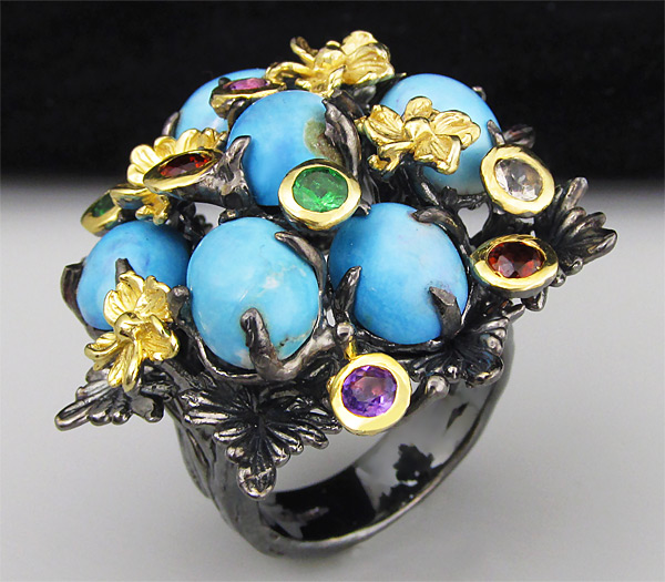 Кольцо из черненого стерлингового серебра 925 пробы с бирюзой, аметистами, сапфирами, цаворитами и мозамбикскими гранатами. Вес кольца — 22,4 гр. Площадка кольца — 36×36 мм. Выборочное золочение.