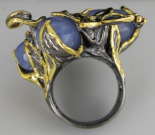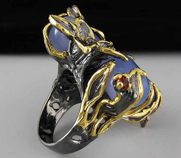 Кольцо из черненого стерлингового серебра 925 пробы с халцедоном и сапфирами. Вес кольца — 32,1 гр. Площадка кольца — 43×35 мм. Выборочное золочение.