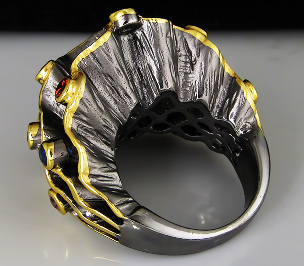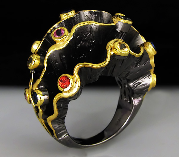 Кольцо из черненого стерлингового серебра 925 пробы с разноцветными сапфирами. Вес кольца — 17,5 гр. Площадка кольца — 30×15 мм. Выборочное золочение.