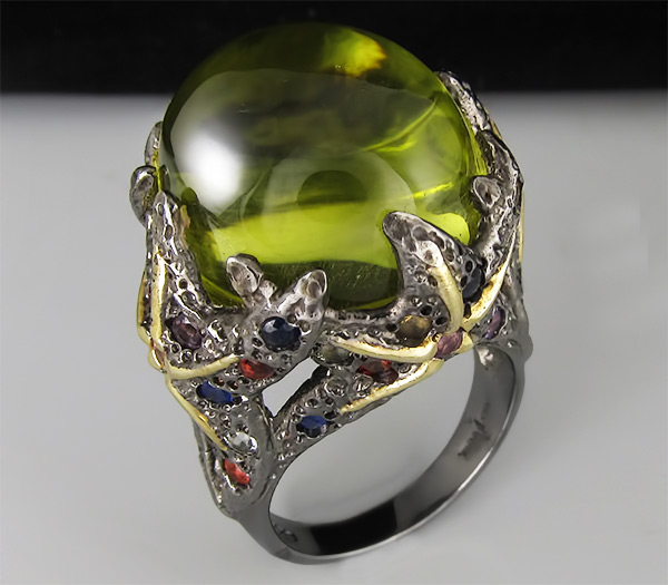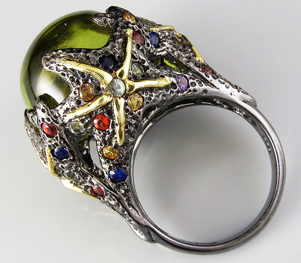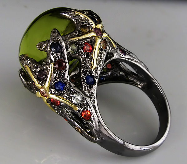 Кольцо из черненого стерлингового серебра 925 пробы с цитрином, аметистами и сапфирами. Вес кольца — 17,9 гр. Площадка кольца — 24×24 мм. Выборочное золочение.В наличии кольцо размером: 17.75