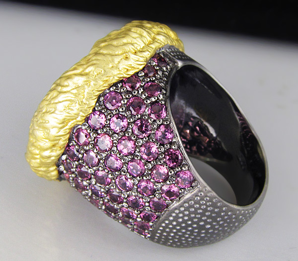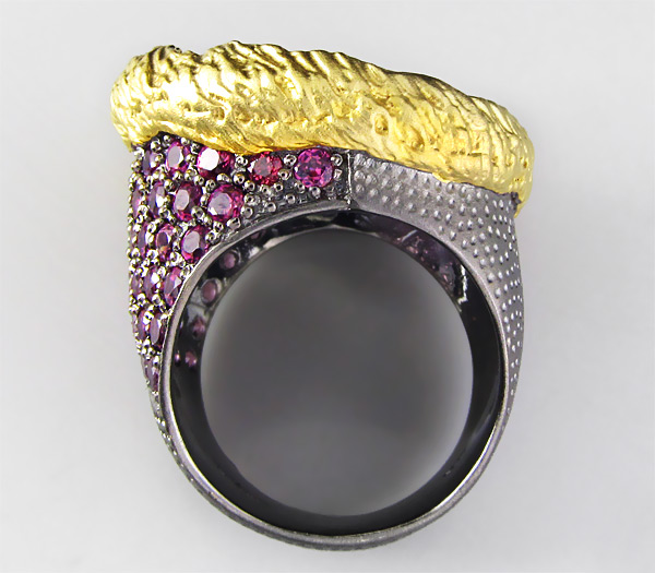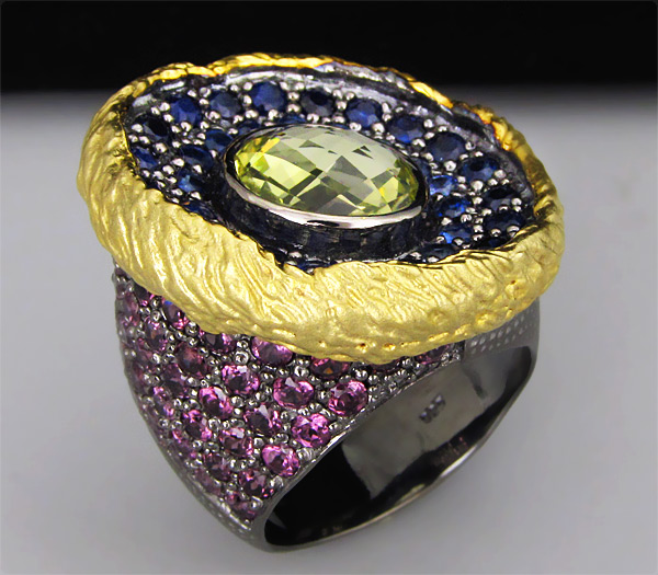 Кольцо из черненого стерлингового серебра 925 пробы с цитрином, родолитами гранатами и сапфирами. Вес кольца — 22,5 гр. Площадка кольца — 28×27 мм. Выборочное золочение.