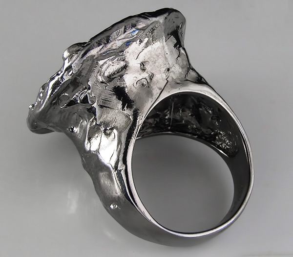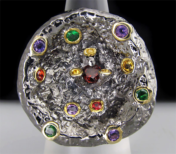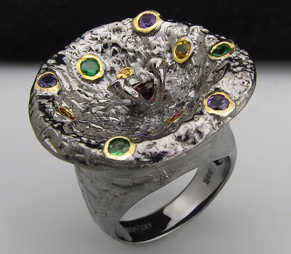 Кольцо из черненого стерлингового серебра 925 пробы с цаворитами гранатами, аметистами и сапфирами. Вес кольца — 12,7 гр. Площадка кольца — 27×27 мм. Выборочное золочение.
