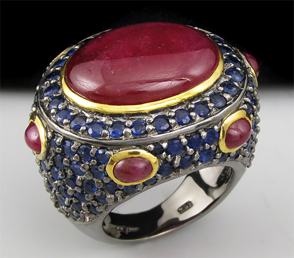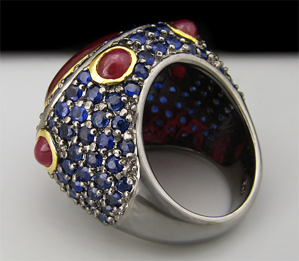 Кольцо из черненого стерлингового серебра 925 пробы с рубинами и сапфирами. Вес кольца — 25 гр. Площадка кольца — 33×27 мм. Выборочное золочение.