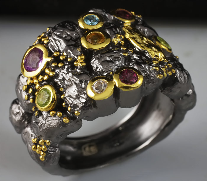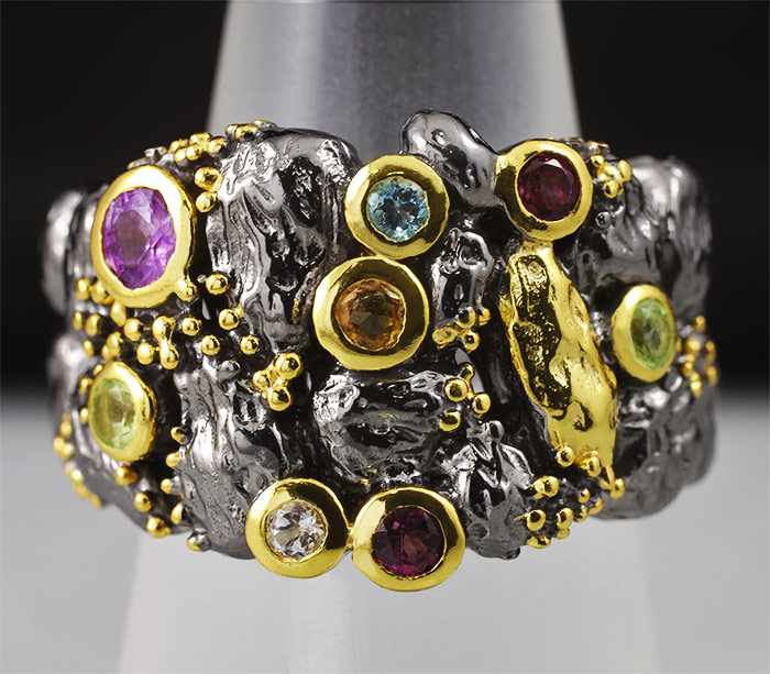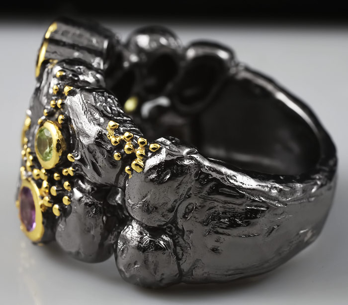 Кольцо из черненого стерлингового серебра 925 пробы с аметистом, перидотами, топазом, цитрином и родолитами гранатами. Вес кольца — 10,9 гр. Площадка кольца — 24×16 мм. Выборочное золочение.