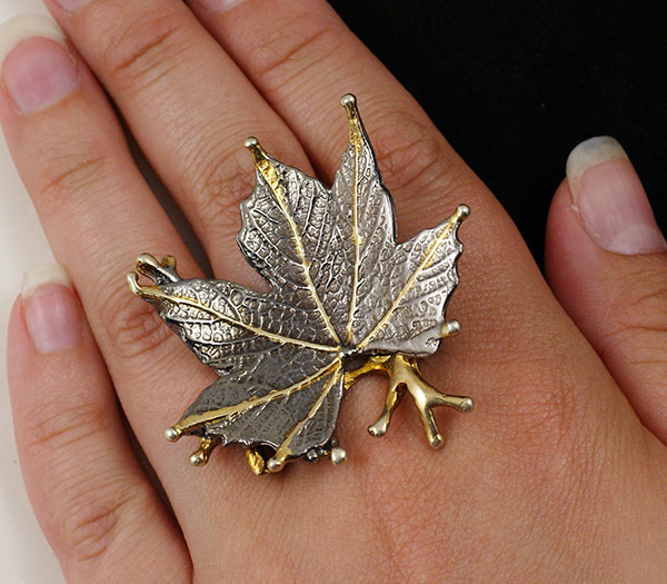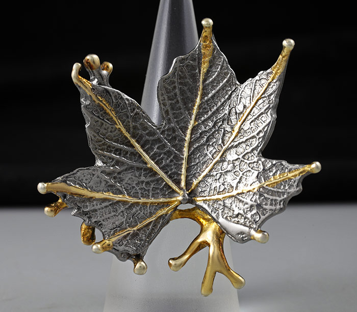 Кольцо-листок из серебра 925 пробы. Серебро 925, Золочение, Чернение Инкрустация: Без вставок Вес изделия: 20,8 грамм Размер: 17,75