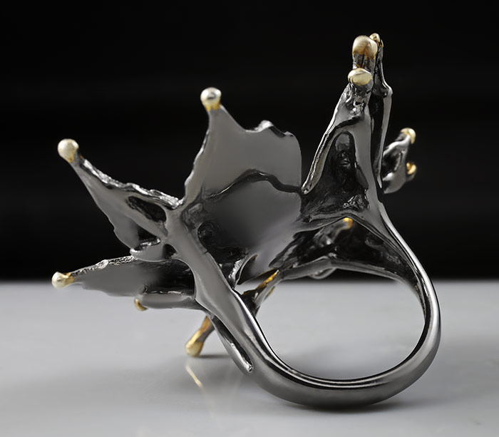 Кольцо из черненого стерлингового серебра 925 пробы. Вес кольца — 20,8 гр. Площадка кольца — 46×45 мм. Выборочное золочение.